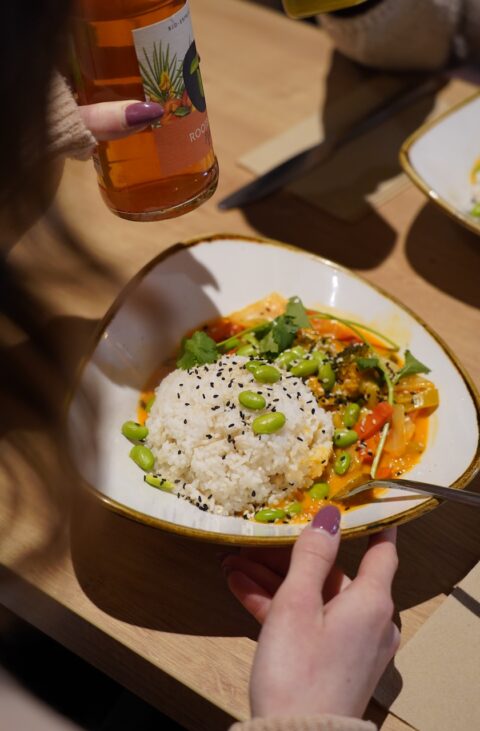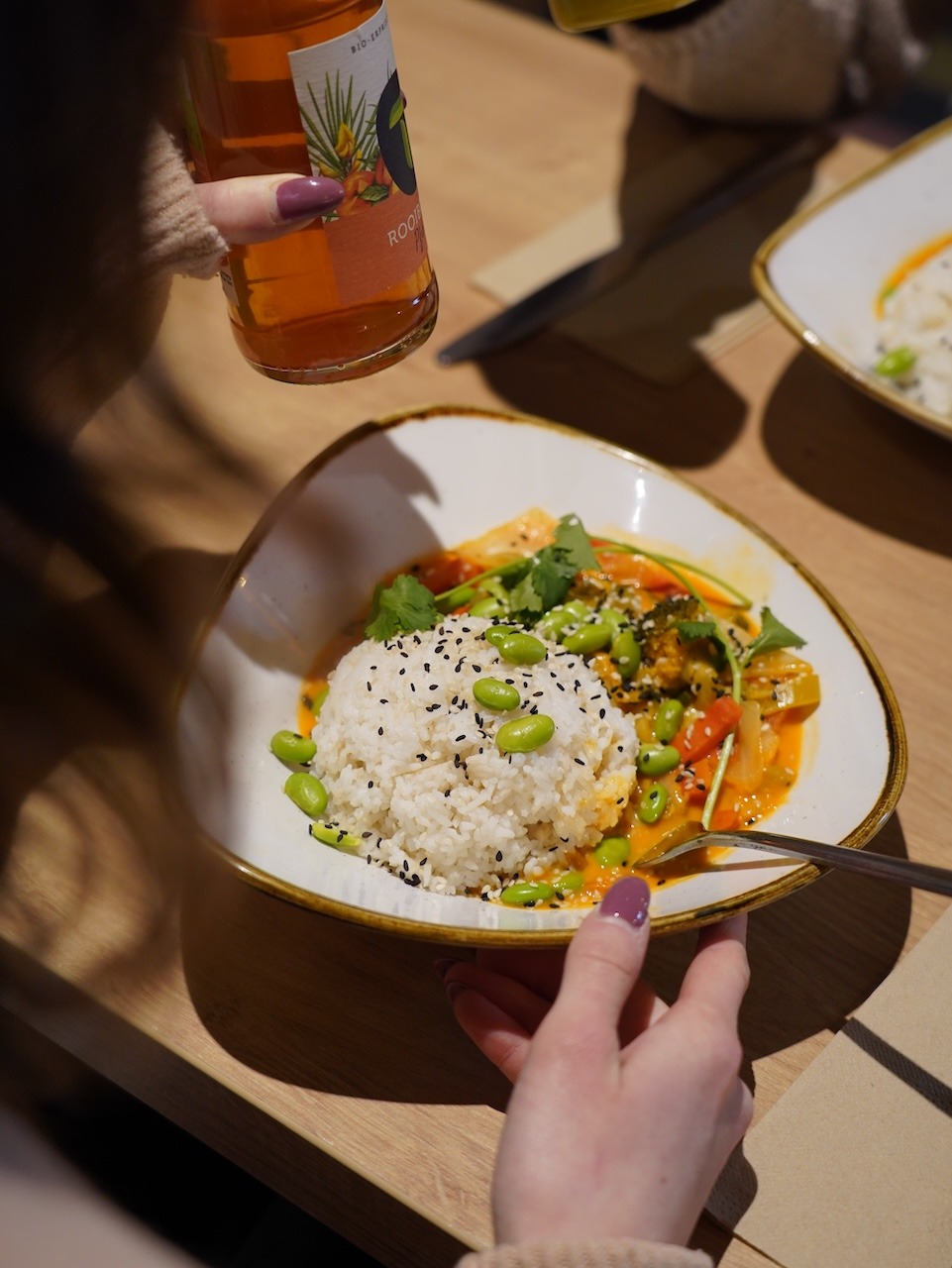 Bowl s grilovanými kuřecími kousky, čerstvou zeleninou, červeným zelím, sojovými boby Edamame, arašídy, čerstvým koriandrem, sezamem a mangovo-kokosovou omáčkou.
