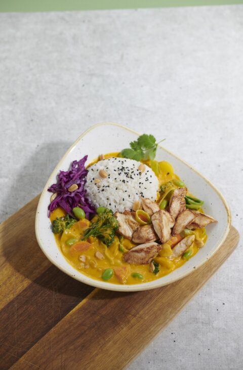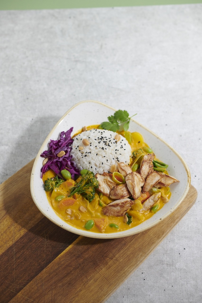 Bowl s grilovaným planted.chicken, čerstvou zeleninou, červeným zelím, sojovými boby Edamame, arašídy, čerstvým koriandrem, sezamem a mangovo-kokosovou omáčkou.