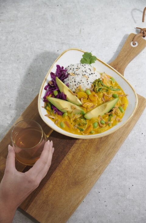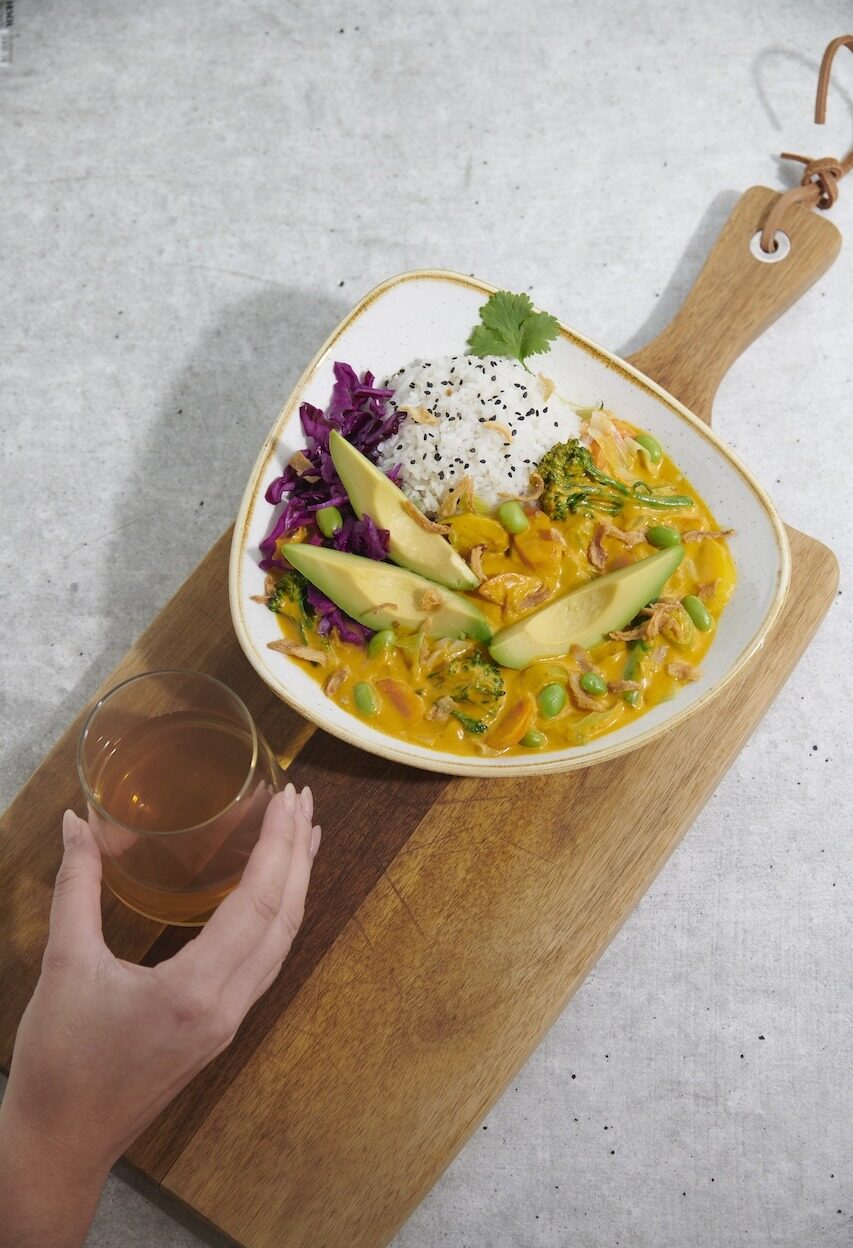 Čerstvá zelenina, krémové avokádo, jemné sójové boby Edamame, křupavá smažená cibulka, voňavý čerstvý koriandr a sezamová semínka. Celou kombinaci korunuje lahodná mangovo-kokosová omáčka, která dodá tropický šmrnc.