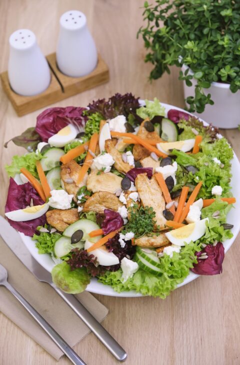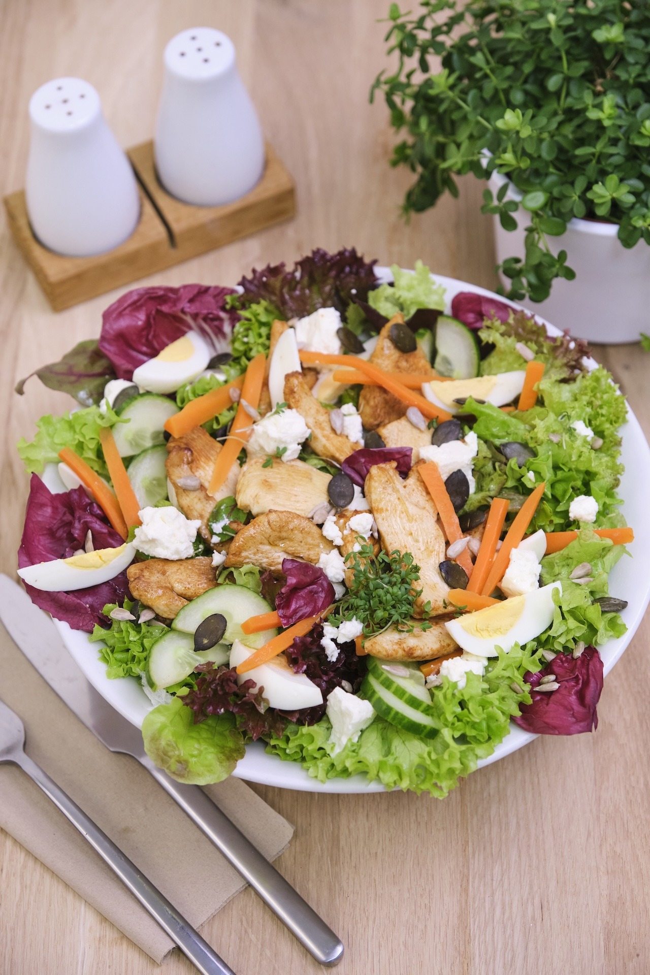 Šťavnaté grilované kuřecí prsa, křupavá mrkev, jemný feta sýr, svěží okurka, vajíčko z volného chovu, směs dýňových a slunečnicových semínek a čerstvá řeřicha. Podáváme s rukolovým dresinkem, který dodá salátu výraznou a svěží chuť.