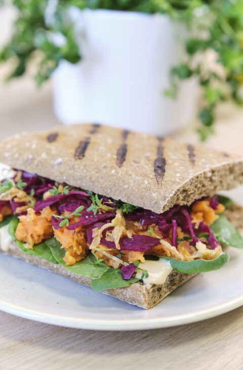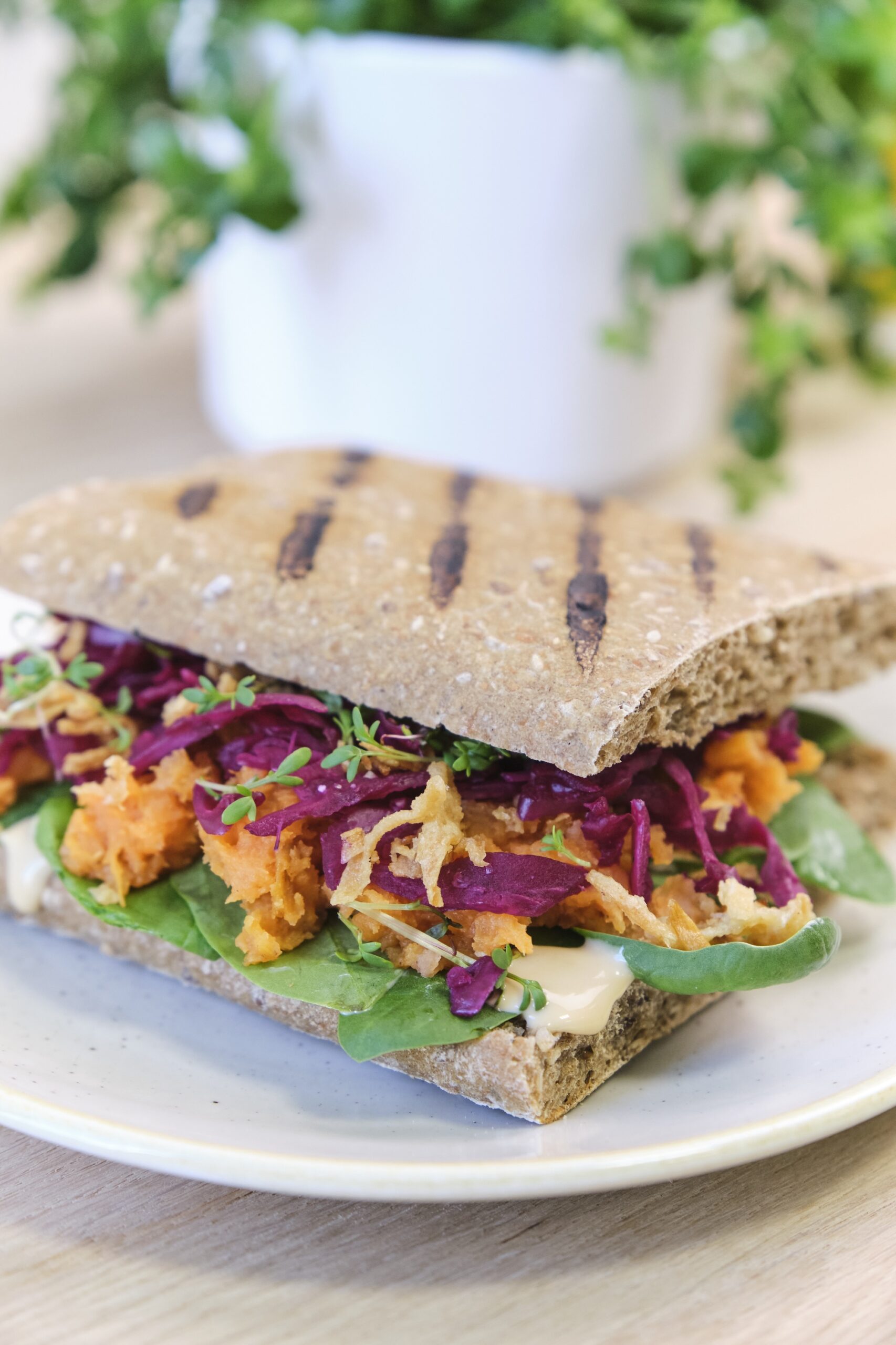 Čerstvě grilovaný sendvič plněný jemnými kousky sladkých brambor, křupavým červeným zelím, svěžím baby špenátem, restovanou cibulkou a čerstvou řeřichou. To vše dokonale doplněné krémovou miso majonézou, která dodá sendviči jemnou umami chuť.
